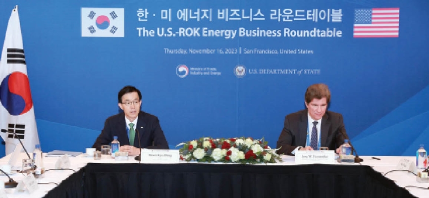 | Bộ trưởng Công nghiệp Hàn Quốc Bang Moon-kyu và Thứ trưởng Ngoại giao Mỹ Jose Fernandez tại hội nghị bàn tròn về kinh doanh năng lượng sạch ngày 16/11. Ảnh: Yonhap |