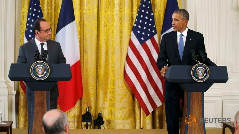 Hai nhà lãnh đạo Mỹ và Pháp đã có bài phát biểu trong một cuộc họp báo ở Nhà Trắng nhân chuyến thăm của Tổng thống Pháp đến Washington để phối hợp một chiến dịch quân sự nhằm chống lại lực lượng IS sau các cuộc tấn công ngày 13/11 vừa qua tại Paris khiến 130 người thiệt mạng.