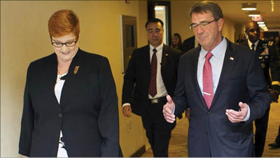 Bộ trưởng Quốc phòng Mỹ Ashton Carter (phải) và người đồng cấp Australia Marise Payne. Ảnh: Reuters