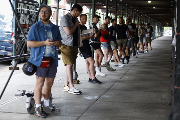 Người dân xếp hàng chờ tiêm vaccine phòng bệnh đậu mùa khỉ ở New York, Mỹ ngày 17/7/2022. (Ảnh: AFP/TTXVN)