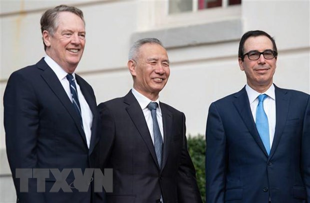 Bộ trưởng Tài chính Mỹ Steven Mnuchin (phải), Đại diện Thương mại Mỹ Robert Lighthizer (trái) và Phó Thủ tướng Trung Quốc Lưu Hạc tại vòng đàm phán thương mại cấp cao mới ở Washington DC., ngày 10/10/2019. Nguồn: THX/TTXVN
