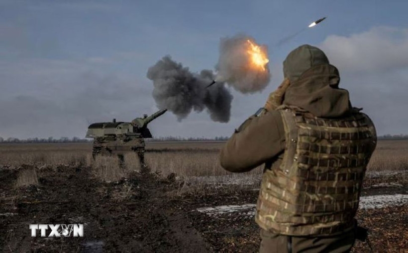 Binh sỹ Ukraine bắn lựu pháo bọc thép 2000 trong cuộc xung đột với Nga. (Nguồn: Reuters/TTXVN)