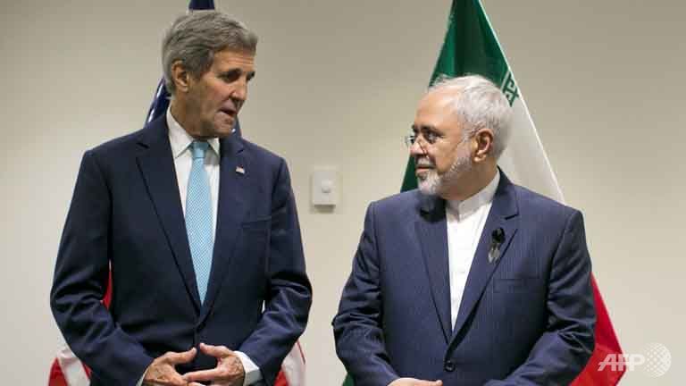 Ngoại trưởng Mỹ John Kerry và người đồng cấp Iran Javad Zarif trong một cuộc nói chuyện song phương tại trụ sở LHQ ở New York ngày 26/9. Ảnh: AFP