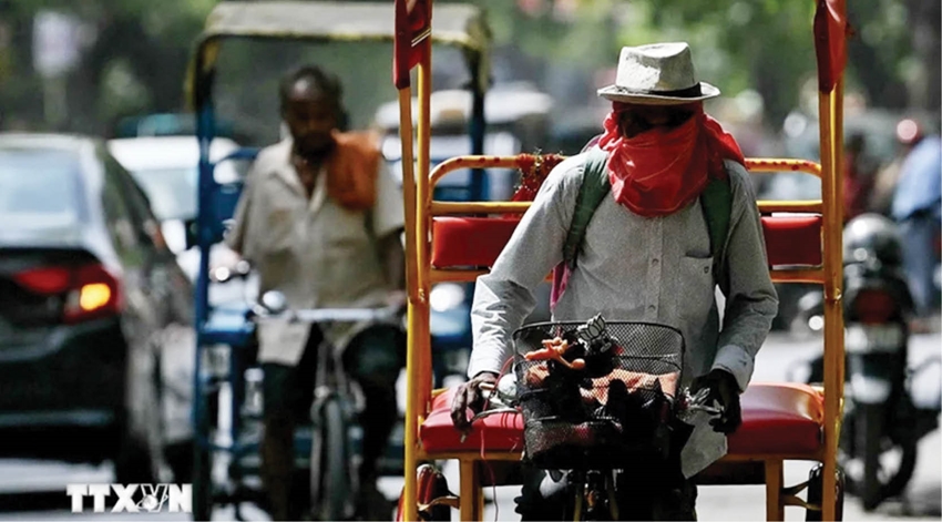 | Người lao động đội mũ và dùng khăn để tránh nắng nóng khi làm việc ngoài trời tại New Delhi, Ấn Độ. Ảnh minh họa: AFP/TTXVN |