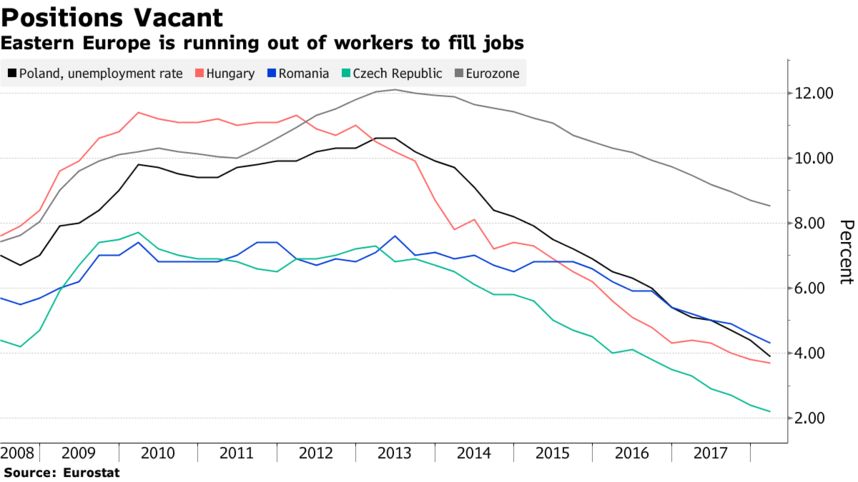 Biểu đồ thể hiện tỉ lệ thất nghiệp thấp kỷ lục tại các nước Đông Âu. Ảnh: Bloomberg