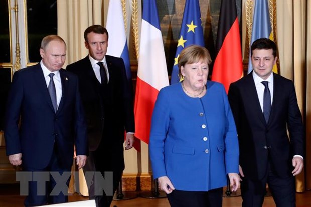 (Từ trái sang) TT. Nga Vladimir Putin, TT. Pháp Emmanuel Macron, TTg Đức Angela Merkel và TT. Ukraine Volodymyr Zelensky tới Hội nghị thượng đỉnh nhóm Bộ tứ Normandy ở Paris (Pháp). Ảnh: TTXVN