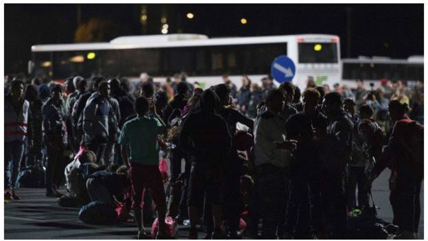 Dòng người di cư chờ xe buýt tại khu vực giữa biên giới Áo và Hungary. Ảnh: BBC.