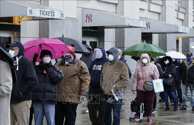 Người dân đeo khẩu trang phòng lây nhiễm COVID-19 tại một điểm tiêm chủng ở New York, Mỹ. Ảnh: AFP/TTXVN