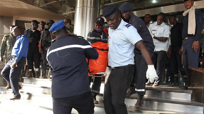 Cảnh sát đưa thi thể nạn nhân ra khỏi khách sạn Blu sau vụ tấn công. Ảnh:AFP