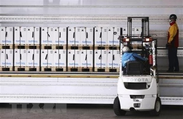 Lô vaccine ngừa COVID-19 thứ 3 của hãng Pfizer/BioNtech sau khi được chuyển từ Bỉ tới Tokyo, Nhật Bản, ngày 1/3/2021. Nguồn: Kyodo/TTXVN