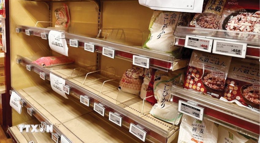 | Nhiều kệ hàng bán gạo trong siêu thị Nhật Bản trống trơn vì thiếu nguồn cung, khiến giá gạo tăng cao. Ảnh: TTXVN |