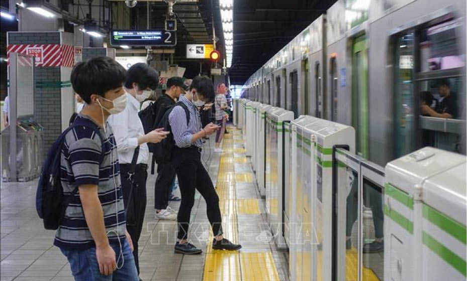 Hành khách tại một nhà ga tàu điện ngầm ở Thủ đô Tokyo, Nhật Bản trong bối cảnh đại dịch COVID-19 lây lan. Ảnh minh họa: THX/TTXVN