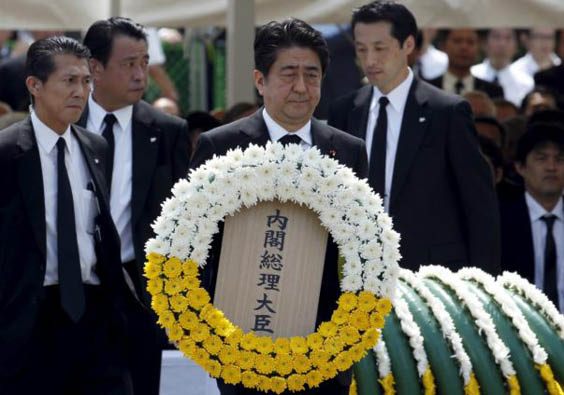Thủ tướng Nhật Bản Shinno Abe đặt vòng hoa tại lễ kỷ niệm 70 năm thảm họa hạt nhân ở Nagasaki ngày 9/8/2015. Ảnh: Reuters