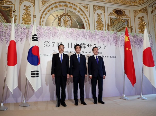 Từ trái sang: Thủ tướng Trung Quốc Lý Khắc Cường, Thủ tướng Nhật Bản Shinzo Abe và Tổng thống Hàn Quốc Moon Jae-in tại một hội nghị thượng đỉnh ba bên. Ảnh minh hoạ: AFP/TTXVN