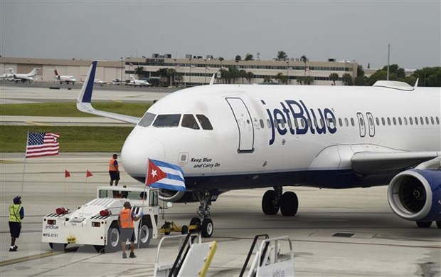Máy bay của Hãng hàng không Mỹ JetBlue chuẩn bị cất cánh trong hành trình tới Cuba, từ sân bay quốc gia Fort Lauderdale, bang Florida (Mỹ). Ảnh: AFP/TTXVN