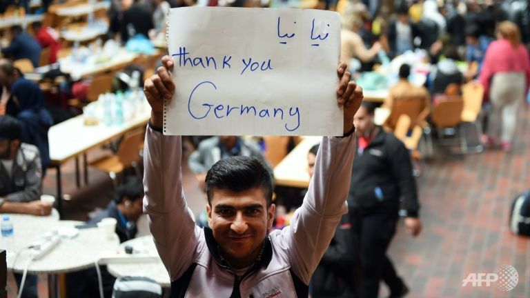 Một người tị nạn vui mừng “cảm ơn nước Đức” sau khi đến ga xe lửa Dortmund, Đức. Ảnh: AFP
