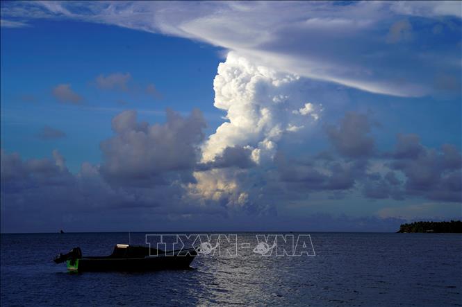 Những đám mây bụi bốc lên trời sau khi núi lửa trên đảo Hunga Ha'apai, quốc đảo Tongo, phun trào, ngày 21/12/2021. Ảnh: AFP/TTXVN