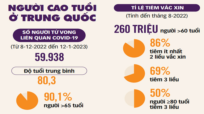 Nhưng đến ngày 14-1, Trung Quốc bất ngờ công bố gần 60.000 ca tử vong ở bệnh viện liên quan COVID-19 từ 8-12-2022 đến 12-1-2023. Cụ thể, theo Ủy ban Y tế quốc gia Trung Quốc, độ tuổi trung bình của những người tử vong là 80,3 tuổi.