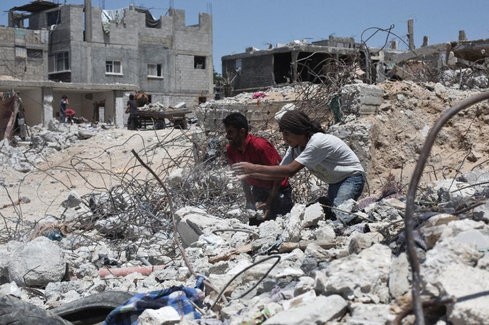 Người dân Palestine thu dọn đống đổ nát của tòa nhà bị phá hủy trong cuộc chiến giữa quân đội Israel và Hamas - Ảnh: AFP