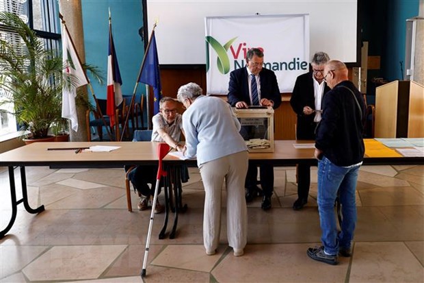 Cử tri Pháp bỏ phiếu bầu Quốc hội tại điểm bầu cử ở Calvados, ngày 12/6/2022. (Ảnh: AFP/TTXVN)