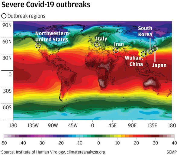 Các điểm nóng COVID-19 của thế giới như Vũ Hán, Hàn Quốc, Iran... đều nằm trong phạm vi 30-50 độ vĩ Bắc - Ảnh: SCMP