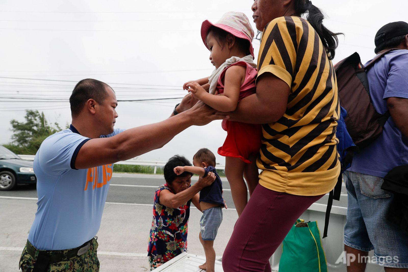 Một gia đình được cảnh sát hỗ trợ sơ tán khỏi khu vực nguy hiểm. Ảnh minh họa: AP/Aron Favila