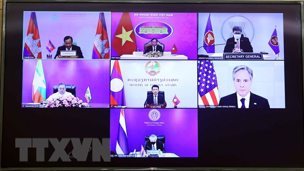 Bộ trưởng Ngoại giao các nước tham dự hội nghị theo hình thức trực tuyến. (Ảnh: Phạm Kiên/TTXVN)