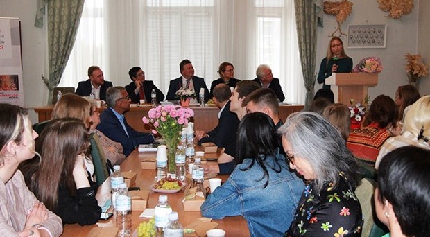 Lễ ra mắt bộ giáo trình tiếng Việt tại trường Đại học tổng hợp quốc gia Kiev (Ukraine). (Nguồn: baoquocte.vn)
