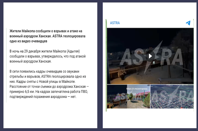 | Thông tin do kênh ASTRA đăng tải trên Telegram cho biết vào rạng sáng 29/12/2025 đã có các tiếng nổ trong thành phố Maykop và có một cuộc tấn công nhằm vào sân bay quân sự Khanskaya. Ảnh chụp màn hình ASTRA/Telegram |