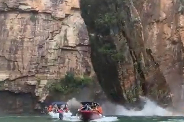 Hình ảnh tàng đá lớn đổ sập xuống các thuyền chở du khách tại hồ Furnas (Brazil).
