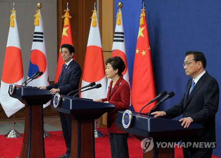 | Lãnh đạo 3 nước Nhật-Hàn-Trung trong cuộc họp thượng đỉnh ngày 1/11/2015. Ảnh: Yonhap. |
