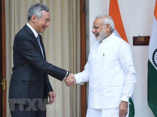 Thủ tướng Ấn Độ Narendra Modi (bên phải) và Thủ tướng Singapore Lý Hiển Long trong một cuộc gặp ở thủ đô New Delhi, Ấn Độ. Ảnh minh họa: AFP/TTXVN