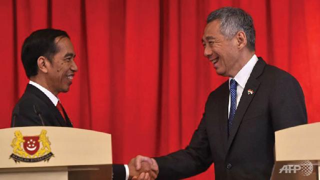 Tổng thống Indonesia Joko Widodo (trái) bắt tay với Thủ tướng Singapore Lý Hiển Long. Ảnh: AFP
