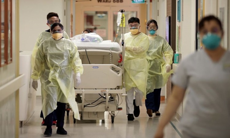 Các nhân viên y tế tại Bệnh viện Đa khoa Singapore di chuyển một bệnh nhân COVID-19 tới khu điều trị cách ly. Ảnh: Straits Times.