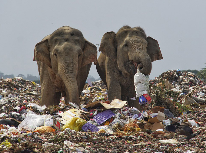 Những chú voi đang kiếm ăn ở một bãi rác đầy sản phẩm nhựa tại Sri Lanka. Ảnh: Kinhtemoitruong