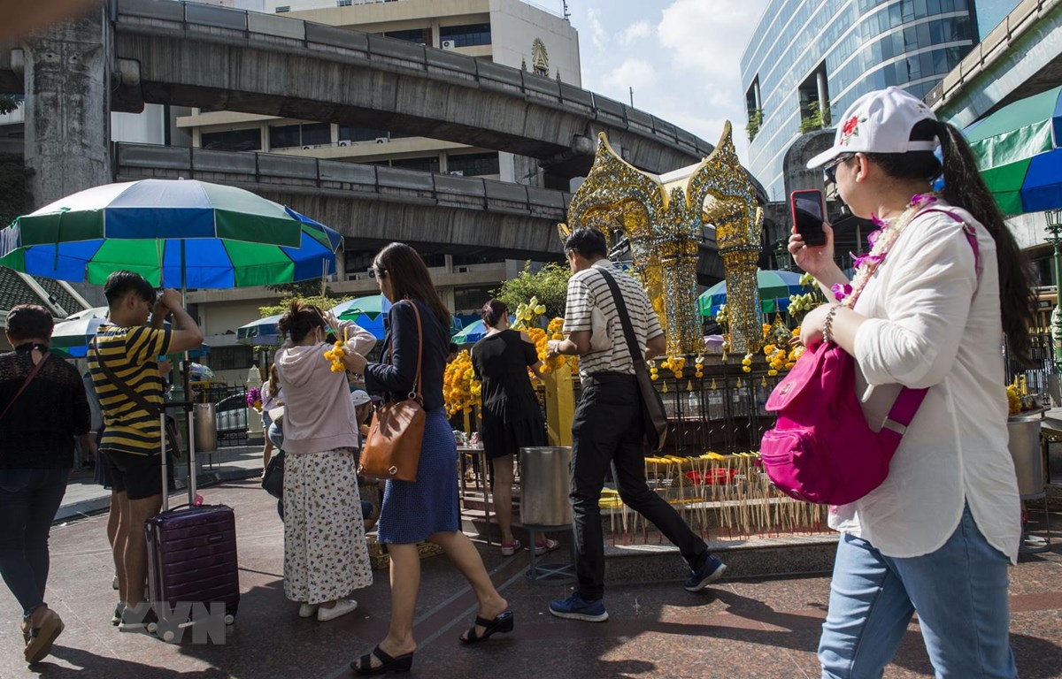 Khách du lịch tham quan đền Erawan ở thủ đô Bangkok của Thái Lan. Ảnh: AFP/TTXVN