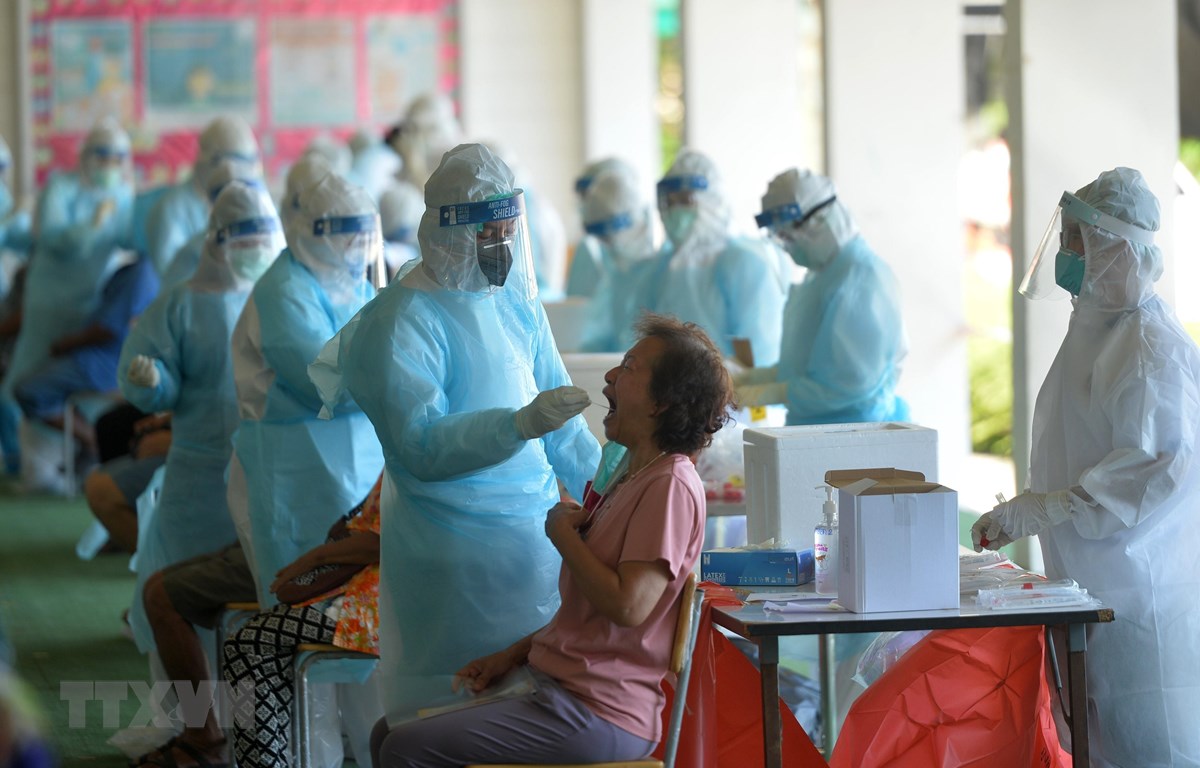 Nhân viên y tế lấy mẫu xét nghiệm COVID-19 cho người dân tại Bangkok, Thái Lan ngày 13/5/2021. (Ảnh: THX/TTXVN)