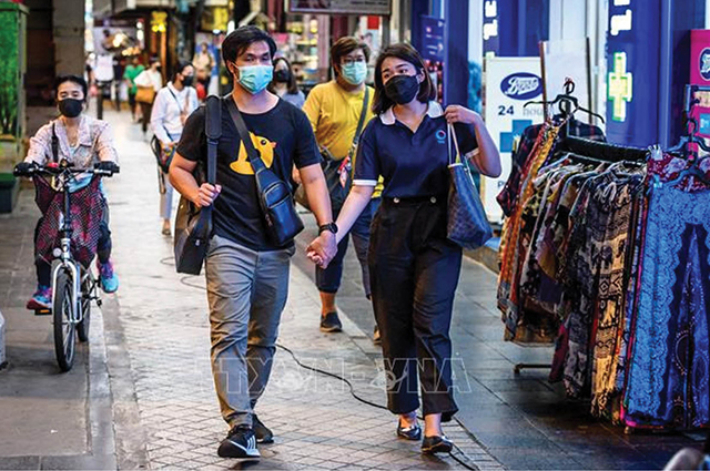 Người dân ở thủ đô Bangkok, Thái Lan đeo khẩu trang nhằm phòng tránh lây nhiễm dịch bệnh COVID-19 Ảnh minh họa: AFP/TTXVN