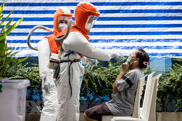 Nhân viên y tế trong trang phục bảo hộ lấy mẫu xét nghiệm COVID-19 cho người dân tại Bangkok, Thái Lan. (Ảnh: AFP/TTXVN)