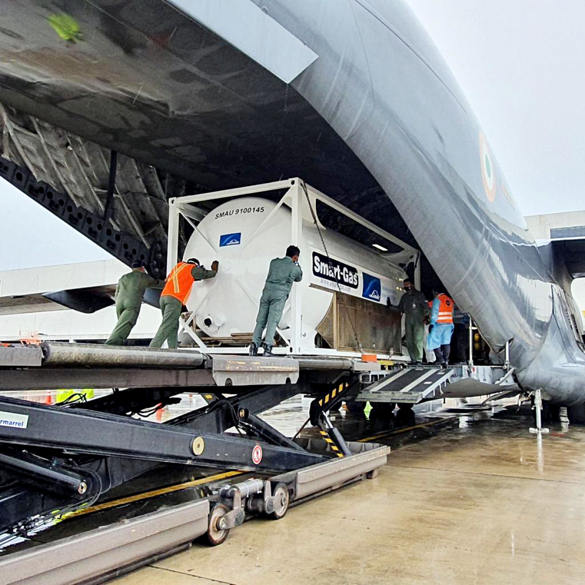 4 bồn chứa oxy lỏng được Không quân Ấn Độ đưa từ Singapore về để đáp ứng nhu cầu vận chuyển oxy rất cấp thiết. Ảnh ANI