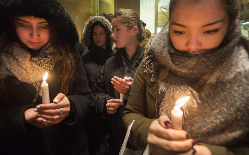 Người dân tham gia buổi cầu nguyện bên ngoài lãnh sự quán Pháp tại Montreal, Canada ngày 14/11. Ảnh: AP