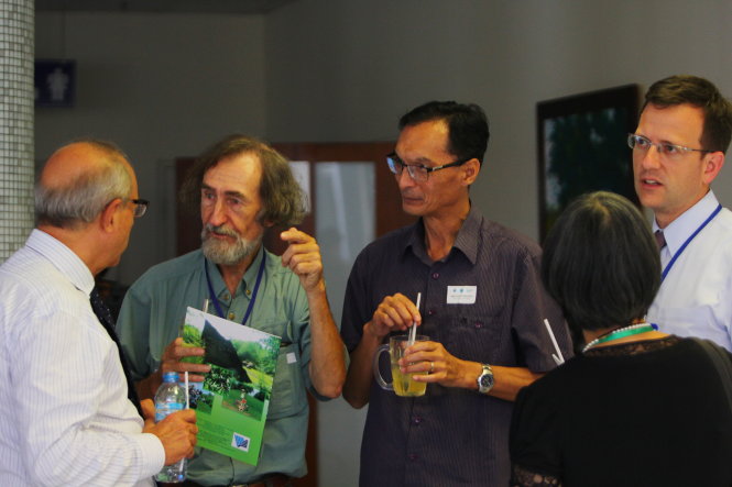 | Các học giả thảo luận bên lề hội thảo quốc tế về tình hình sử dụng nguồn nước sông Mekong ngày 22-4 - Ảnh: Chí Quốc |