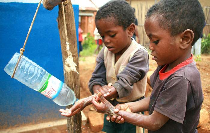 Trẻ em ở Madagascar sử dụng nguồn nước hạn hẹp để rửa tay. Ảnh: Usaid