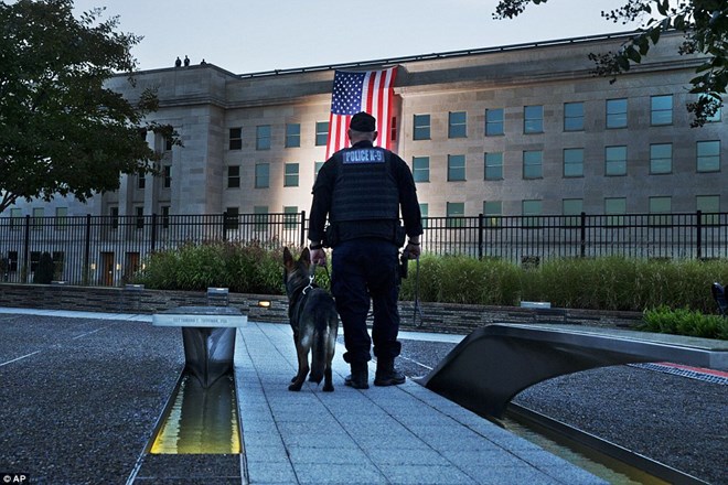 Một nhân viên an ninh đứng gác ở khu vực đài tưởng niệm sự kiện 11/9 ở Lầu Năm Góc, một trong những địa điểm bị khủng bố 15 năm trước. (Nguồn: AP)