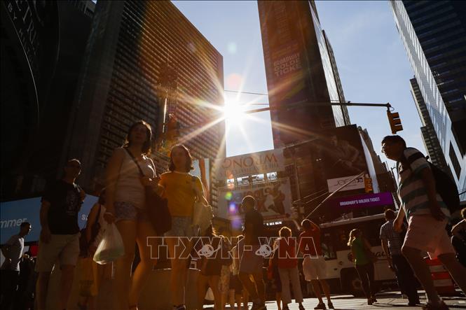 Người dân đi bộ trên Quảng trường Thời Đại ở New York, Mỹ, trong ngày nắng nóng. Ảnh: AFP/TTXVN