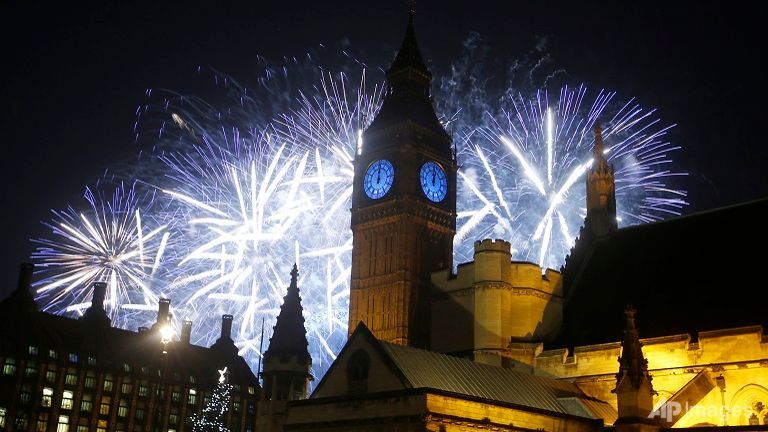Pháo hoa đón năm mới ở tháp đồng hồ Big Ben, thủ đô London, Anh. Ảnh: AP