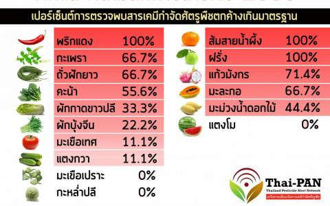 Khảo sát của Hệ thống cảnh báo thuốc trừ sâu Thái Lan (Thai-Pan) tiến hành trên 138 mẫu rau và trái cây phổ biến ở Bangkok, Chiang Mai và Ubon Ratchathani từ ngày 16-18/3 vừa qua. Những mẫu này được gửi đến một phòng thí nghiệm ở Anh để kiểm tra, sử dụng phương pháp lọc dư lượng thuốc trừ sâu để kiểm tra 450 chất.