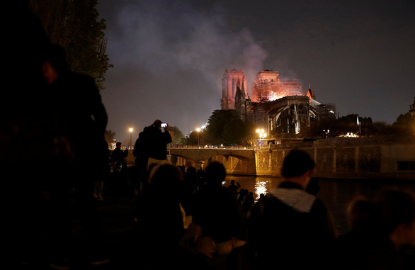 Người dân tập trung bên bờ sông để xem cứu cháy cho Nhà thờ Đức Bà - Ảnh: REUTERS