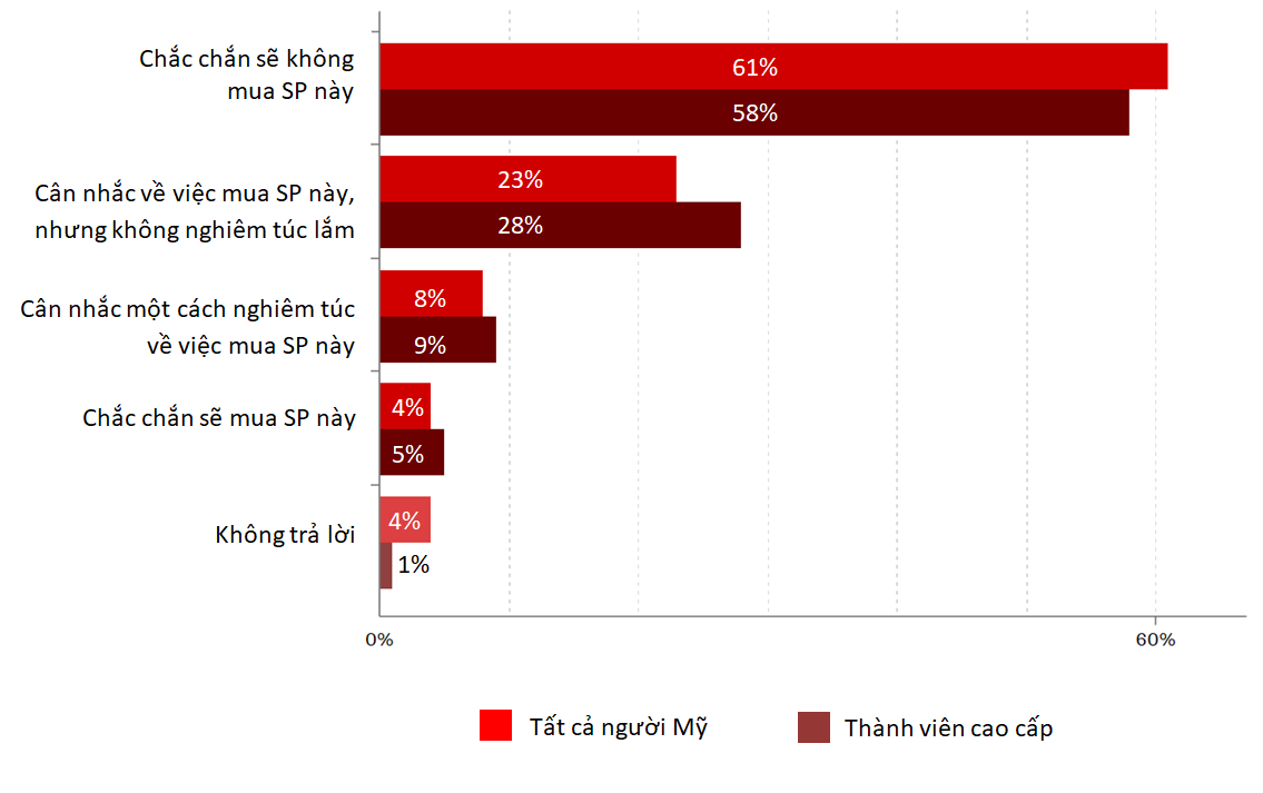 Tỷ lệ này chỉ thấp hơn một chút so với 61% tất cả những người trưởng thành ở Mỹ cho biết họ sẽ không mua sản phẩm, đủ để cho thấy sản phẩm này không hấp dẫn một cách rộng rãi,bất kể khách hàng của Amazon là ai.