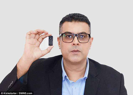 Doanh nhân Shazad Talib cầm chiếc điện thoại được cho là nhỏ nhất thế giới Ảnh: SWNS.com